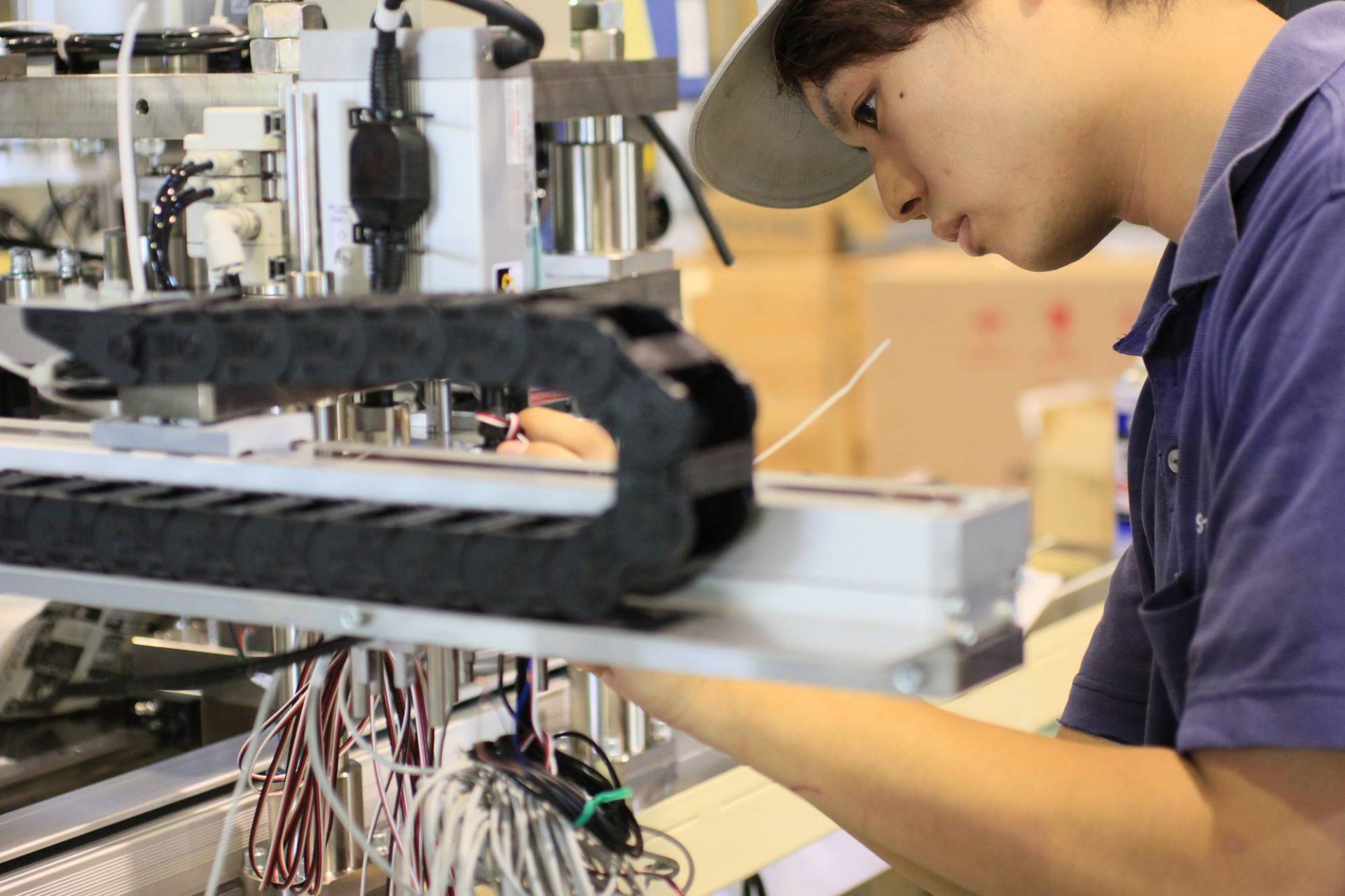 設計からのフローをもとに、組み立ての工程へと移ります。 組立作業は細心の注意を払いながら丁寧に組み立てます。 安全で使いやすく、高い生産性と高稼働を達成するために、 テストを繰り返しながら、動作確認やワーク調整も責任をもって行います。