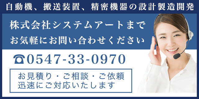 株式会社システムアートでは、一貫した社内製作にこだわり、お客様のご要望にお応えしています。もともと設計業務からスタートした当社ですが、「お客様にもっと必要とされる物を提供したい」との思いから、お客様とのコミュニケーションを大切にし、どうすればもっと役立てるのかを考えて参りました。その結果、当社では開発から製造までを社内で一貫して請け負い、より迅速で細やかな対応をさせていただいております。技術力と想像力でお客様のご要望以上の物を提供する、それが当社のコンセプトです。 専用機や自動機などの生産システムの開発から製作・製造はぜひシステムアートにお任せ下さい。